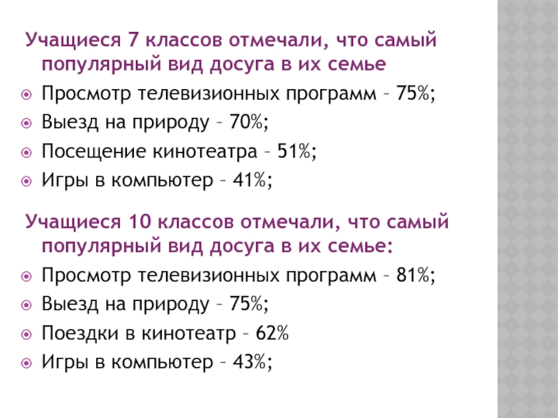 Слайд 8Учащиеся 7 классов отмечали, что самый популярный вид досуга в их