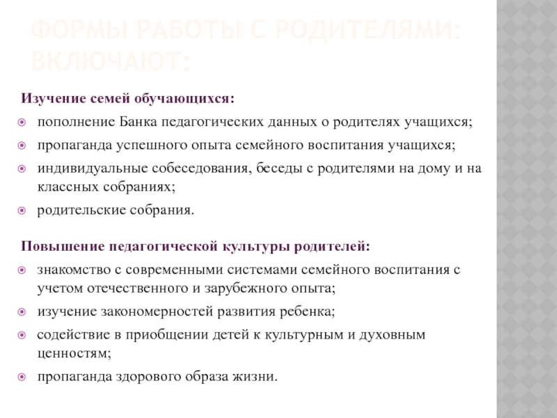 Слайд 27ФОРМЫ РАБОТЫ С РОДИТЕЛЯМИ: