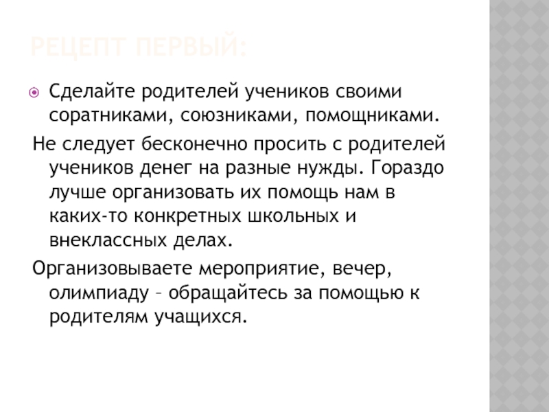 бесконечно просить с родителей учеников денег на разные нужды. Гораздо лучше организовать их помощь нам в каких-то конкретных школьных и внеклассных делах.