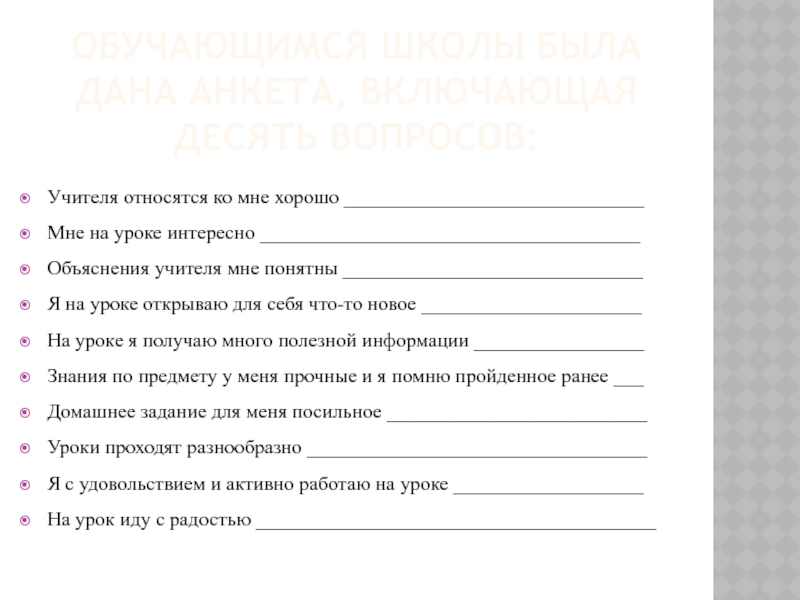 Слайд 15ОБУЧАЮЩИМСЯ ШКОЛЫ БЫЛА ДАНА АНКЕТА, ВКЛЮЧАЮЩАЯ ДЕСЯТЬ ВОПРОСОВ: