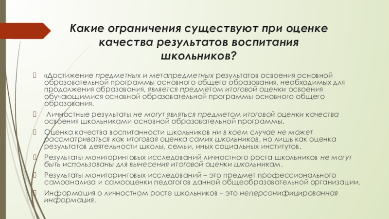 Слайд 29Какие ограничения существуют при оценке качества результатов воспитания