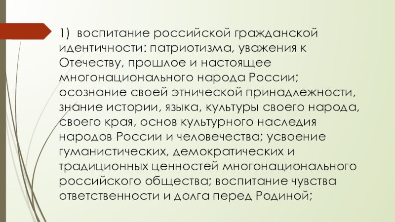 настоящее многонационального народа России; осознание своей этнической принадлежности, знание истории, языка, культуры своего народа, своего края, основ культурного наследия народов России и человечества; усвоение гуманистических, демократических и традиционных ценностей многонационального российского общества; воспитание чувства ответственности и долга перед Родиной;