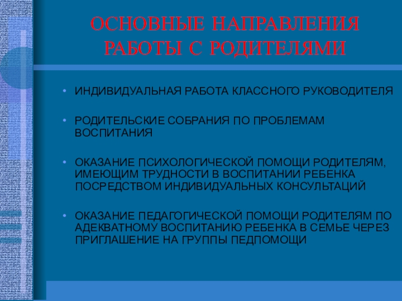 Слайд 20ОСНОВНЫЕ НАПРАВЛЕНИЯ РАБОТЫ С РОДИТЕЛЯМИ