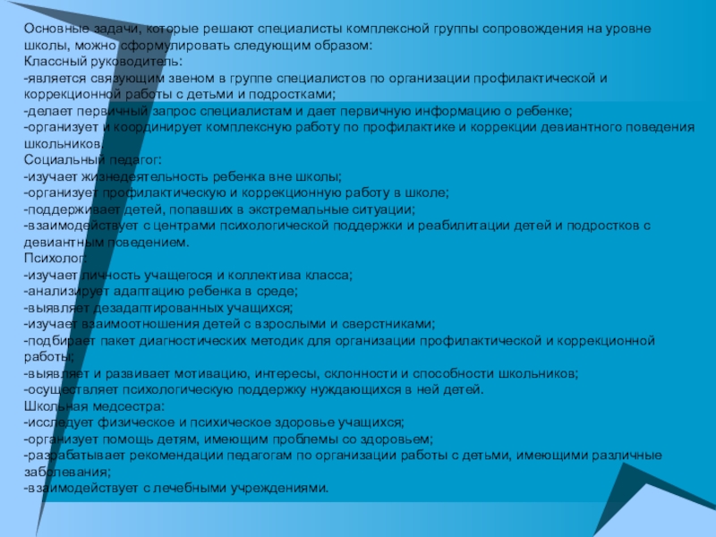 Слайд 6Основные задачи, которые решают специалисты комплексной группы сопровождения на уровне школы,