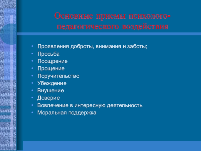 Слайд 17Основные приемы психолого-педагогического воздействия