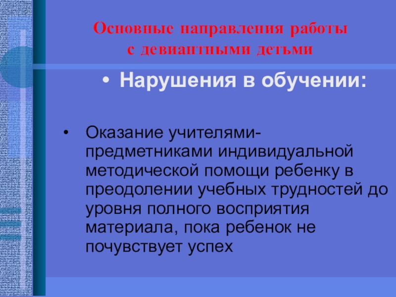 методической помощи ребенку в преодолении учебных трудностей до уровня полного восприятия материала, пока ребенок не почувствует успех