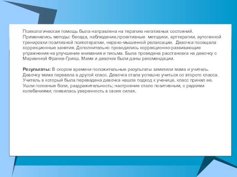 наблюдение,проективные методики, арттерапии, аутогенной тренировки позитивной психотерапии, нервно-мышечной релаксации. Девочка посещала коррекционные занятия. Дополнительно проводились коррекционно-развивающие упражнения на улучшение внимания и письма. Была проведена расстановка на девочку с Марианной Франке-Грикш. Маме и девочке были даны рекомендации.