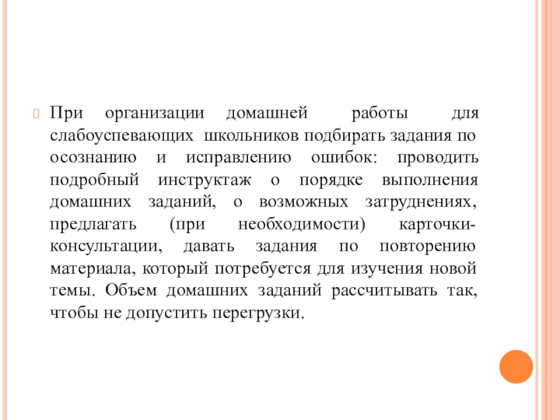 и исправлению ошибок: проводить подробный инструктаж о порядке выполнения домашних заданий, о возможных затруднениях, предлагать (при необходимости) карточки-консультации, давать задания по повторению материала, который потребуется для изучения новой темы. Объем домашних заданий рассчитывать так, чтобы не допустить перегрузки.