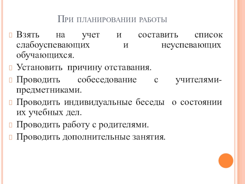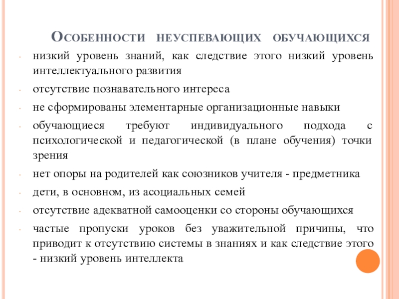 В процессе изучения нового материала внимание слабоуспевающих концентрировать на наиболее важных и сложных разделах изучаемой темы, чаше обращаться к ним с вопросами, выясняющими степень понимания учебного материала.