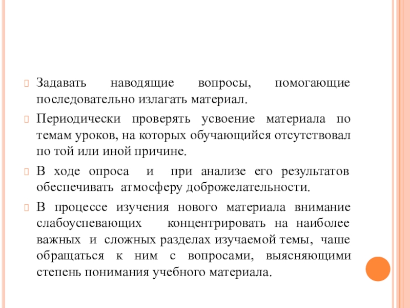 Слайд 15Задавать наводящие вопросы, помогающие последовательно излагать материал.