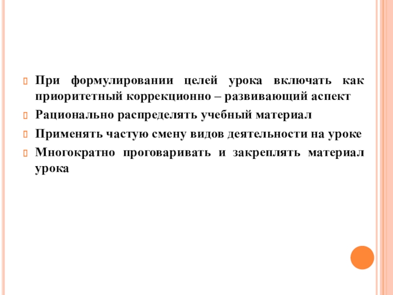 Слайд 10При формулировании целей урока включать как приоритетный коррекционно – развивающий аспект