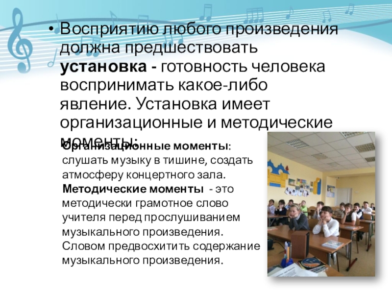 Методические моменты - это методически грамотное слово учителя перед прослушиванием музыкального произведения. Словом предвосхитить содержание музыкального произведения.