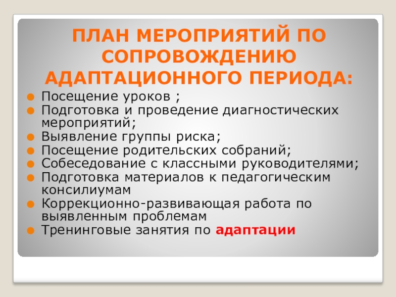 Слайд 24ПЛАН МЕРОПРИЯТИЙ ПО СОПРОВОЖДЕНИЮ АДАПТАЦИОННОГО ПЕРИОДА: