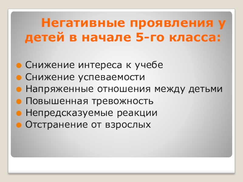 Слайд 12 Негативные проявления у детей в начале 5-го класса: