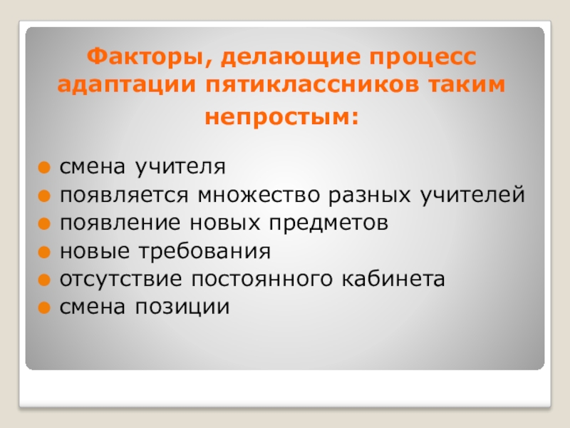 Слайд 13Факторы, делающие процесс адаптации пятиклассников таким непростым: