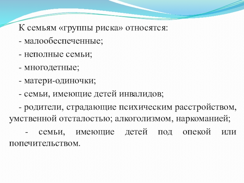 Семьи «группы риска» – это семьи, члены которой уязвимы вследствие складывающихся