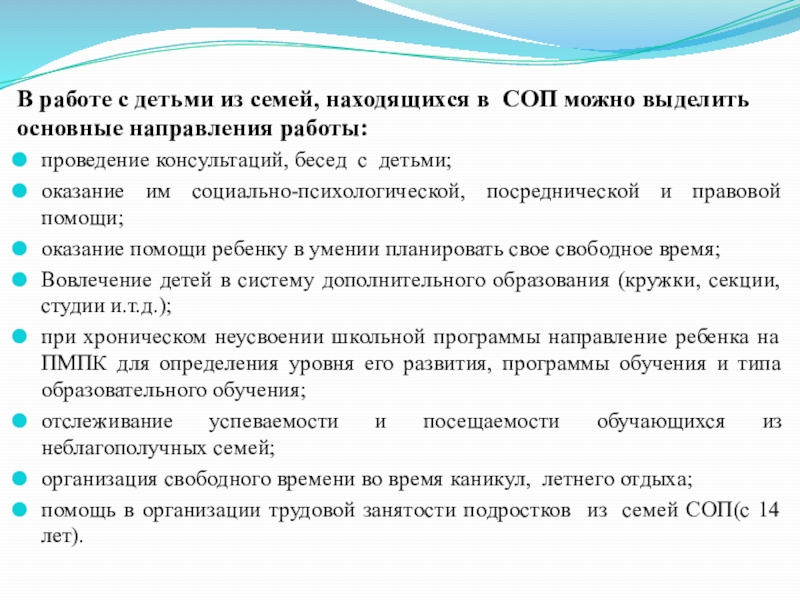 В работе с детьми из семей, находящихся в СОП можно выделить