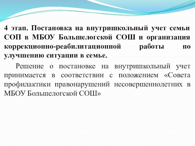 4 этап. Постановка на профилактический учет семьи в МБОУ Большелогской СОШ и организация коррекционно-реабилитационной работы по улучшению ситуации в семье.