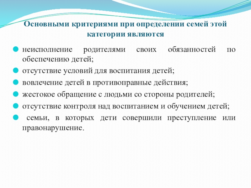 находящихся в социально опасном положении, а также семья, где родители или иные законные представители несовершеннолетних не исполняют своих обязанностей по их воспитанию, обучению и (или) содержанию и (или) отрицательно влияют на их поведение либо жестоко обращаются с ними (по ФЗ №120 от 24.06.1999 «Об основах системы профилактики безнадзорности и правонарушений несовершеннолетних» )