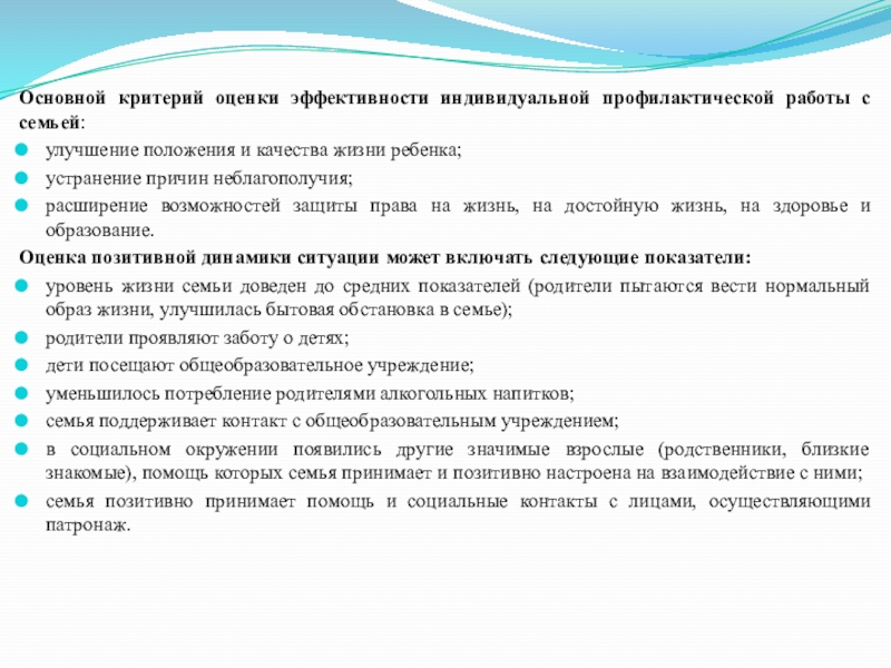 Основной критерий оценки эффективности индивидуальной профилактической работы с семьей: