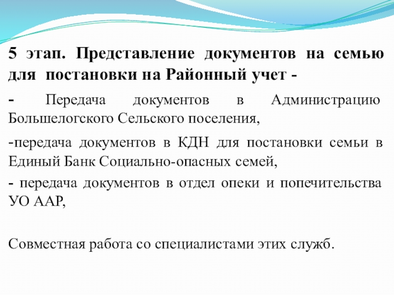 -передача документов в КДН для постановки семьи в Единый Банк Социально-опасных семей,