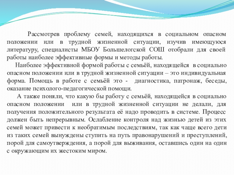 А также поняли, что какую бы работу с семьёй, находящейся в социально опасном положении или в трудной жизненной ситуации не делали, для получения положительного результата её надо проводить в системе. Процесс должен быть непрерывным. Ослабление контроля над жизнью детей из этих семей может привести к необратимым последствиям, так как чаще всего дети из таких семей вынуждены ступить на путь правонарушений и преступлений, порой для самоутверждения, а порой для выживания, оставшись один на один с окружающим их жестоким миром.