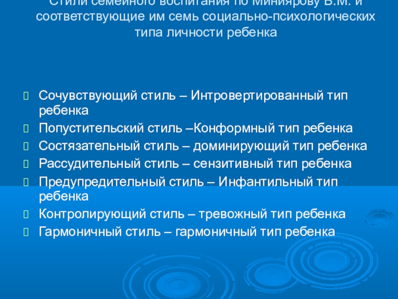 Слайд 8Стили семейного воспитания по Миниярову В.М. и соответствующие им семь социально-психологических