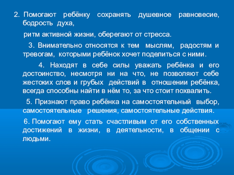 6. Помогают ему стать счастливым от его собственных достижений в жизни, в деятельности, в общении с людьми.