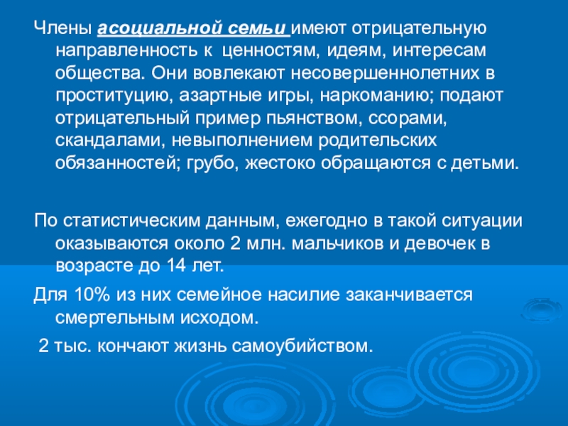 Слайд 7Члены асоциальной семьи имеют отрицательную направленность к ценностям, идеям, интересам общества.