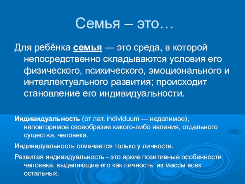 складываются условия его физического, психического, эмоционального и интеллектуального развития; происходит становление его индивидуальности.