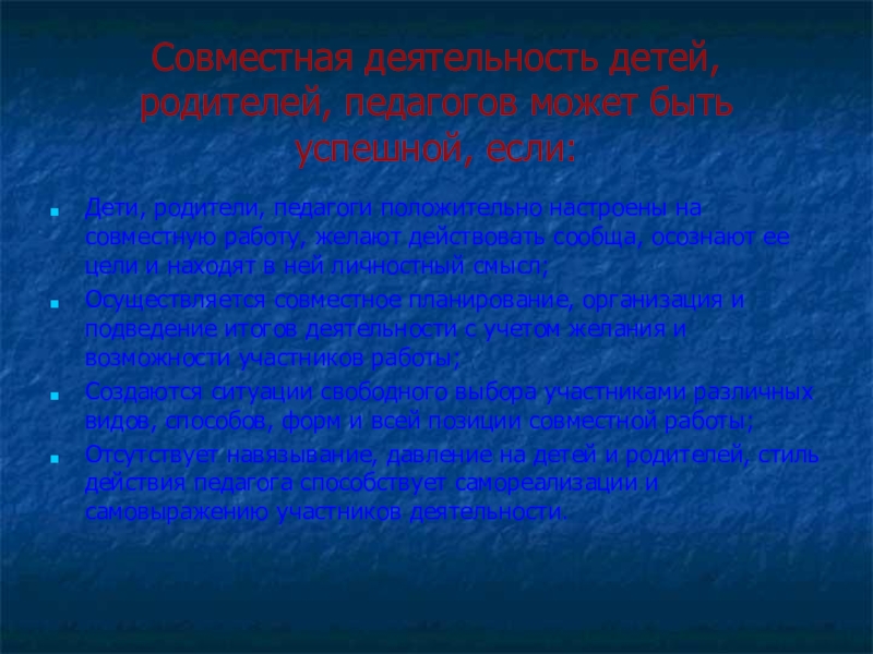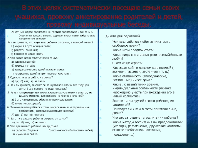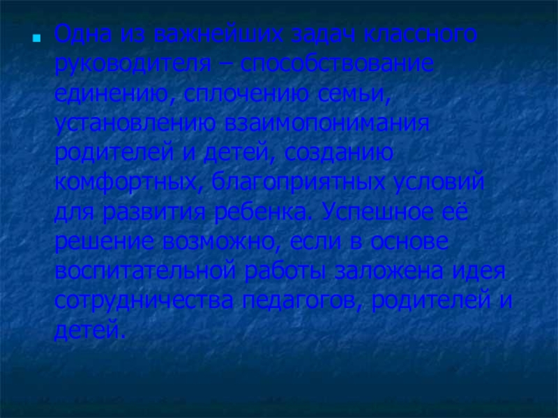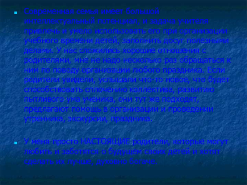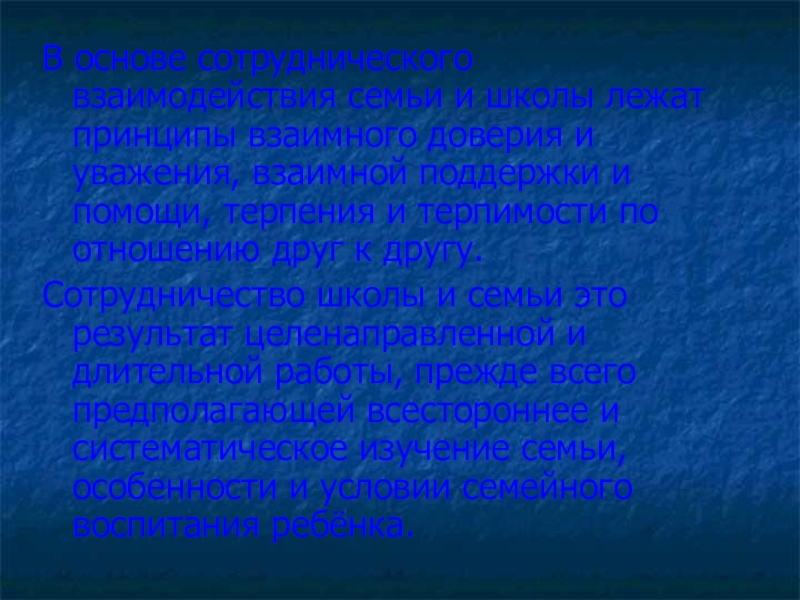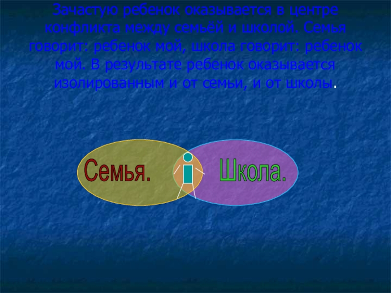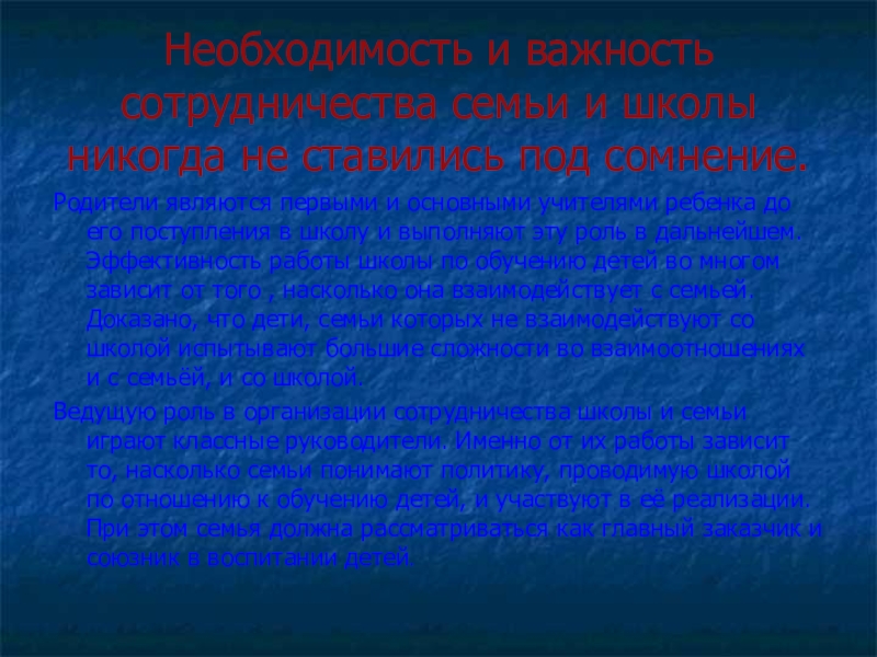 Родители являются первыми и основными учителями ребенка до его поступления в школу и выполняют эту роль в дальнейшем. Эффективность работы школы по обучению детей во многом зависит от того , насколько она взаимодействует с семьей. Доказано, что дети, семьи которых не взаимодействуют со школой испытывают большие сложности во взаимоотношениях и с семьёй, и со школой.