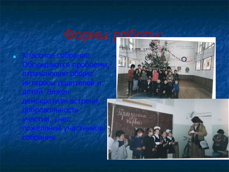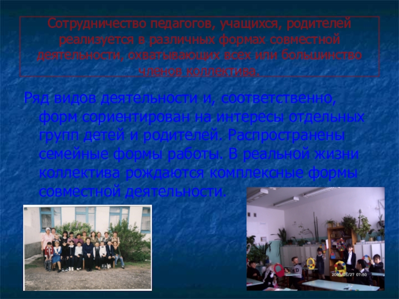 Ряд видов деятельности и, соответственно, форм сориентирован на интересы отдельных групп детей и родителей. Распространены семейные формы работы. В реальной жизни коллектива рождаются комплексные формы совместной деятельности.