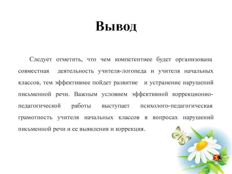 учителя начальных классов, тем эффективнее пойдет развитие и устранение нарушений письменной речи. Важным условием эффективной коррекционно-педагогической работы выступает психолого-педагогическая грамотность учителя начальных классов в вопросах нарушений письменной речи и ее выявления и коррекция.