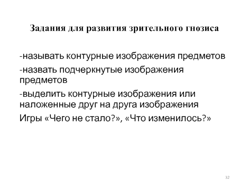 Игры могут быть с предметами – использование муляжей, природного материала. Например: игра “Овощи – фрукты”, “Волшебный мешочек”, уточняется цвет форма, вкус, запах назначение, размер предмета. Упражнения в определении предмета по какому–либо одному качеству (признаку), предметы сравниваются, идет классификация предметов