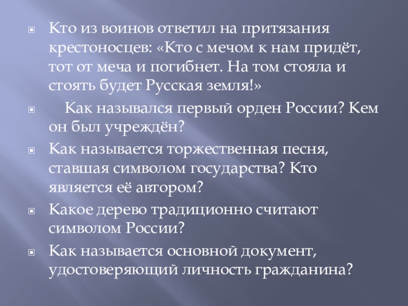 Слайд 8Кто из воинов ответил на притязания крестоносцев: «Кто с мечом к