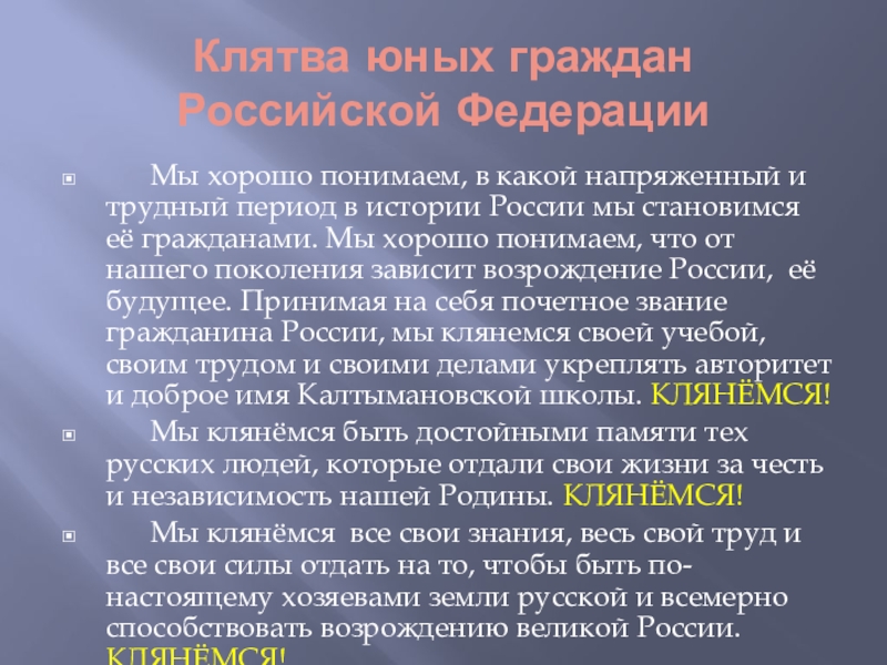 какой напряженный и трудный период в истории России мы становимся её гражданами. Мы хорошо понимаем, что от нашего поколения зависит возрождение России, её будущее. Принимая на себя почетное звание гражданина России, мы клянемся своей учебой, своим трудом и своими делами укреплять авторитет и доброе имя Калтымановской школы. КЛЯНЁМСЯ!
