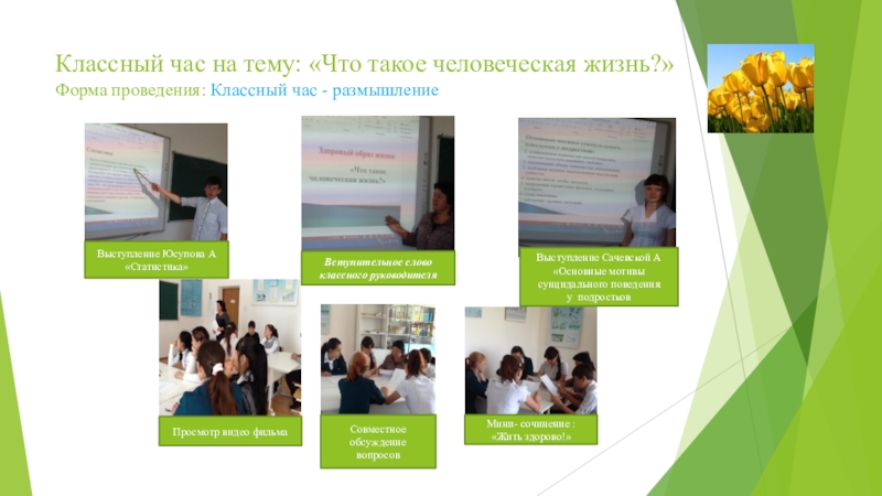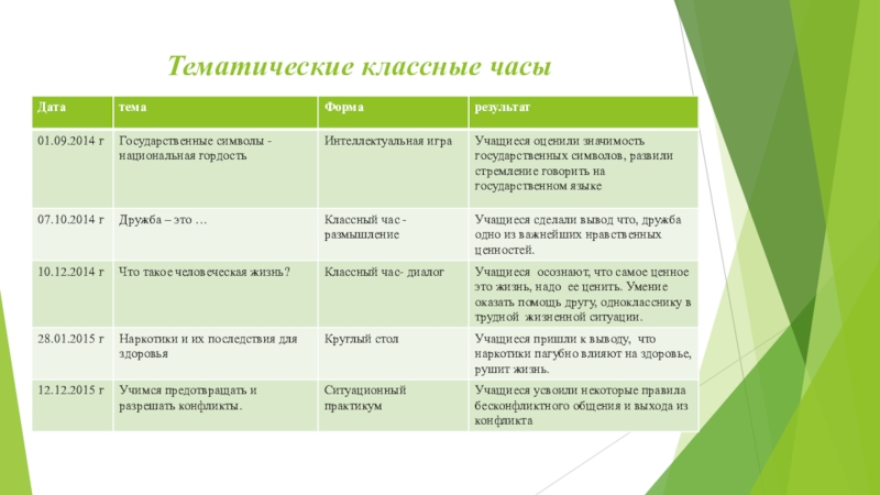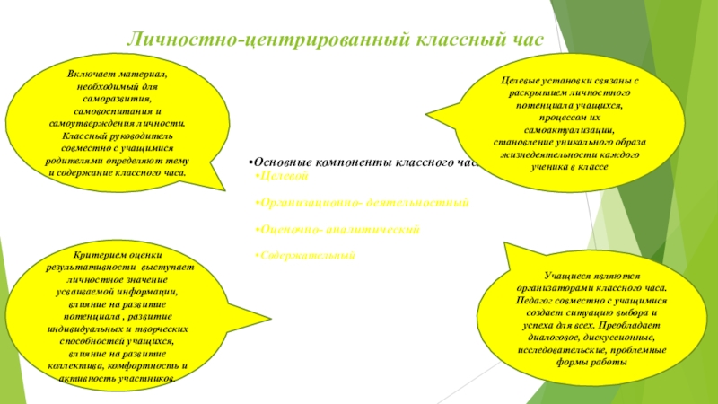 Учащиеся являются организаторами классного часа. Педагог совместно с учащимися создает ситуацию выбора и успеха для всех. Преобладает диалоговое, дискуссионные, исследовательские, проблемные формы работы
