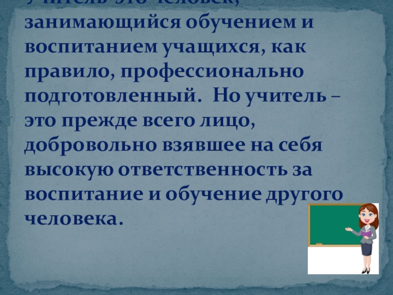 Но учитель – это прежде всего лицо, добровольно взявшее на себя высокую ответственность за воспитание и обучение другого человека.