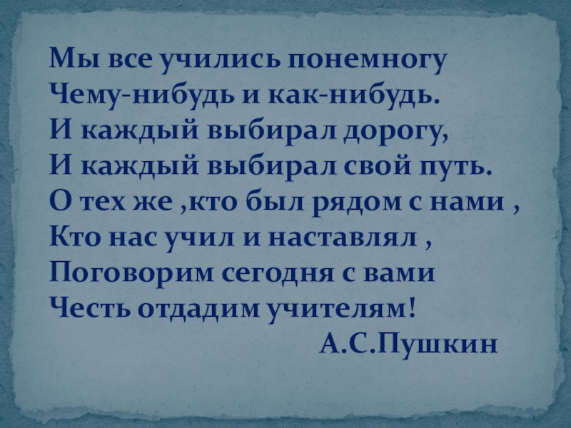 Мы все учились понемногу Чему-нибудь и как-нибудь. И каждый выбирал дорогу, И каждый выбирал свой путь. О тех же ,кто был рядом с нами , Кто нас учил и наставлял , Поговорим сегодня с вами