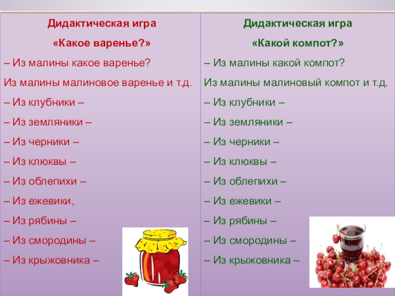 – Из малины какой компот? Из малины малиновый компот и т.д.