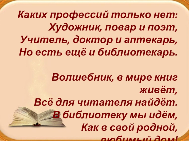 ещё и библиотекарь. Волшебник, в мире книг живёт, Всё для читателя найдёт. В библиотеку мы идём, Как в свой родной, любимый дом!