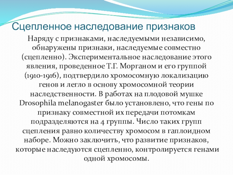 (сцепленно). Экспериментальное наследование этого явления, проведенное Т.Г. Морганом и его группой (1910-1916), подтвердило хромосомную локализацию генов и легло в основу хромосомной теории наследственности. В работах на плодовой мушке Drosophila melanogaster было установлено, что гены по признаку совместной их передачи потомкам подразделяются на 4 группы. Число таких групп сцепления равно количеству хромосом в гаплоидном наборе. Можно заключить, что развитие признаков, которые наследуются сцепленно, контролируется генами одной хромосомы.