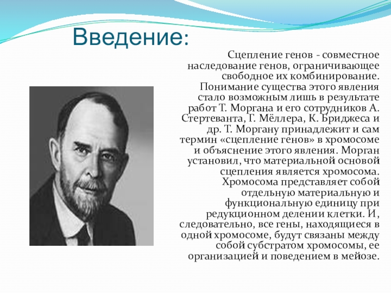 существа этого явления стало возможным лишь в результате работ Т. Моргана и его сотрудников А. Стертеванта, Г. Мёллера, К. Бриджеса и др. Т. Моргану принадлежит и сам термин «сцепление генов» в хромосоме и объяснение этого явления. Морган установил, что материальной основой сцепления является хромосома. Хромосома представляет собой отдельную материальную и функциональную единицу при редукционном делении клетки. И, следовательно, все гены, находящиеся в одной хромосоме, будут связаны между собой субстратом хромосомы, ее организацией и поведением в мейозе.