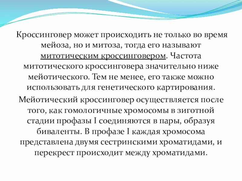 Слайд 9Кроссинговер может происходить не только во время мейоза, но и митоза,