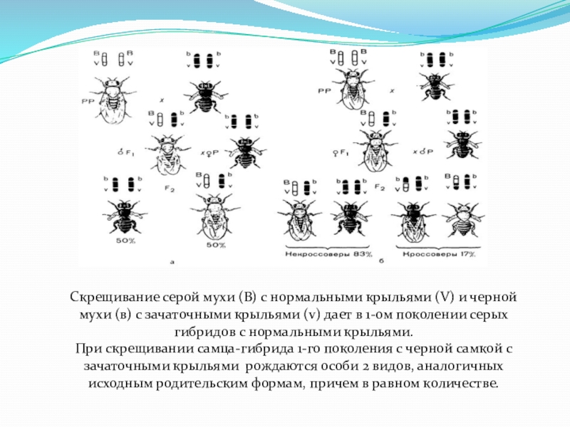 (в) с зачаточными крыльями (v) дает в 1-ом поколении серых гибридов с нормальными крыльями.
