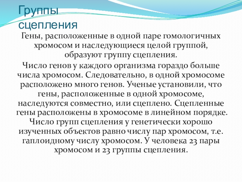 Число генов у каждого организма гораздо больше числа хромосом. Следовательно, в одной хромосоме расположено много генов. Ученые установили, что гены, расположенные в одной хромосоме, наследуются совместно, или сцеплено. Сцепленные гены расположены в хромосоме в линейном порядке. Число групп сцепления у генетически хорошо изученных объектов равно числу пар хромосом, т.е. гаплоидному числу хромосом. У человека 23 пары хромосом и 23 группы сцепления.