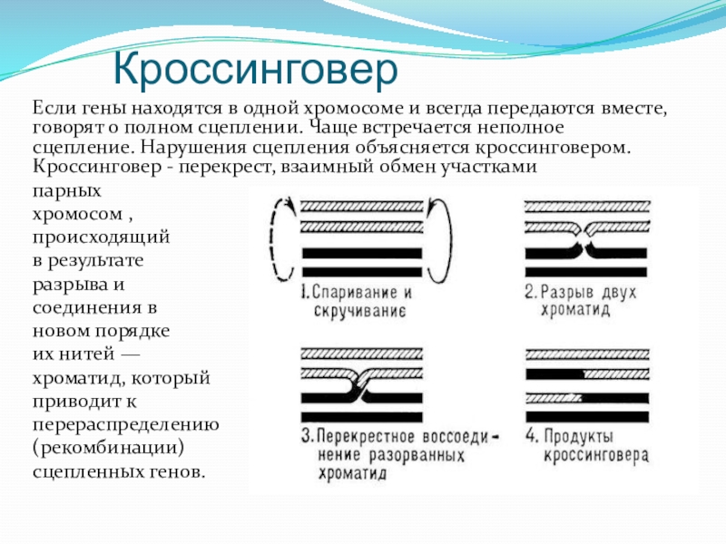 о полном сцеплении. Чаще встречается неполное сцепление. Нарушения сцепления объясняется кроссинговером. Кроссинговер - перекрест, взаимный обмен участками