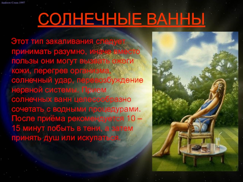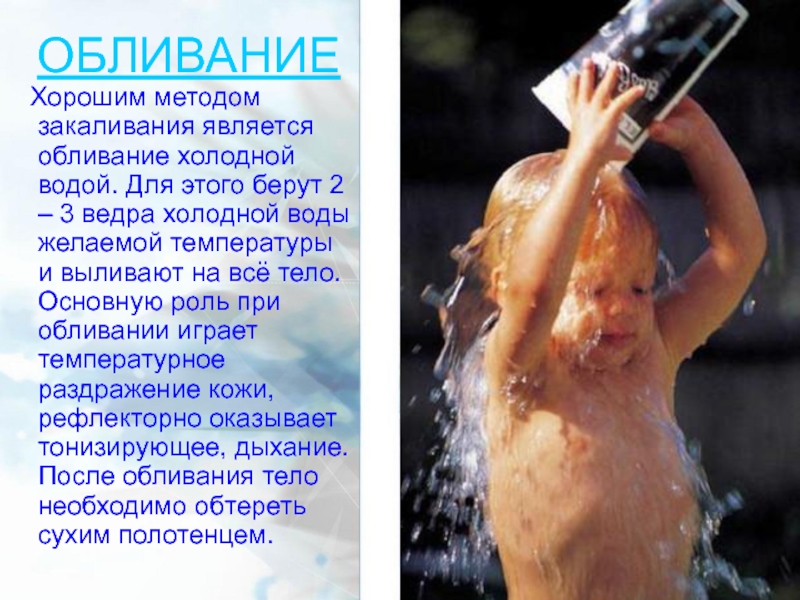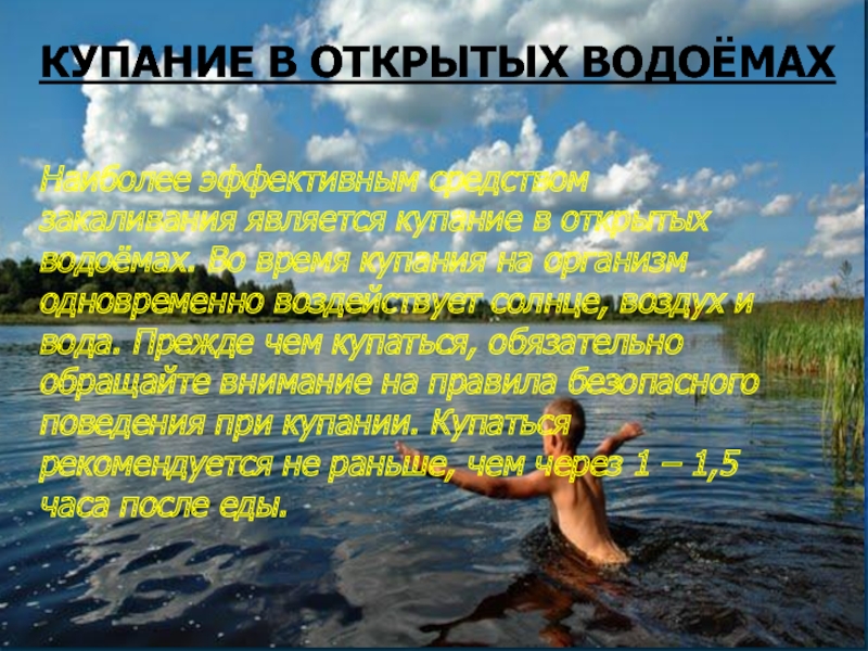 Наиболее эффективным средством закаливания является купание в открытых водоёмах. Во время купания на организм одновременно воздействует солнце, воздух и вода. Прежде чем купаться, обязательно обращайте внимание на правила безопасного поведения при купании. Купаться рекомендуется не раньше, чем через 1 – 1,5 часа после еды.