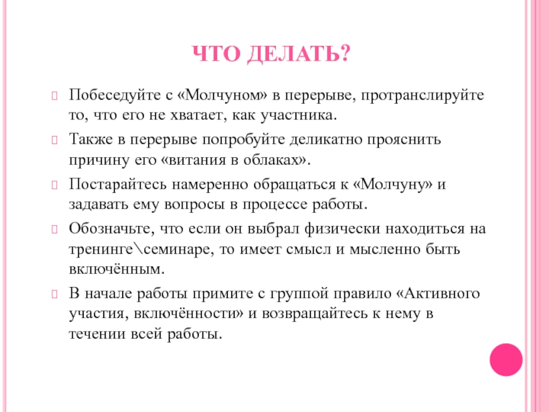 Побеседуйте с «Молчуном» в перерыве, протранслируйте то, что его не