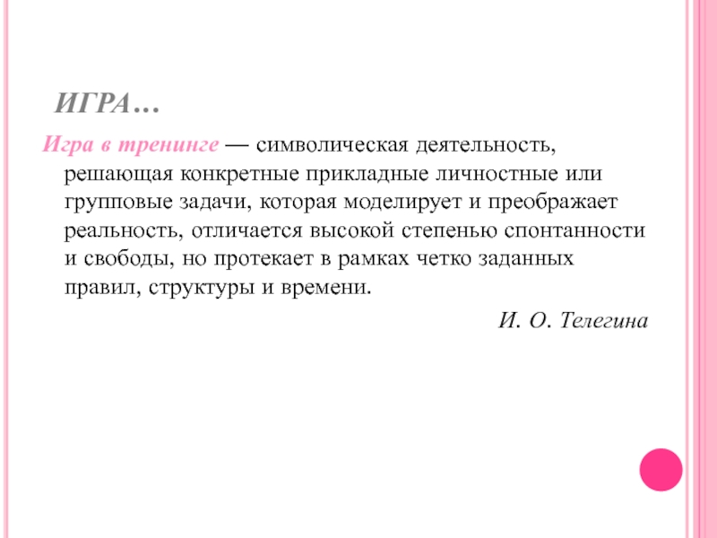 Слайд 3Игра в тренинге — символическая деятельность, решающая конкретные прикладные личностные или